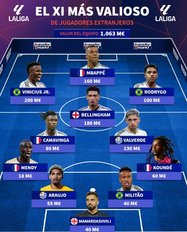 1月21日訊 德轉(zhuǎn)盤點(diǎn)了目前西甲身價(jià)最高的外籍球員陣容,其中姆巴佩、貝林厄姆等9名皇馬球員在列,以下為具體陣容: