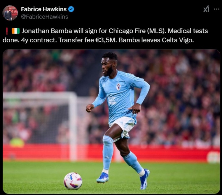 報(bào)道稱班巴已經(jīng)完成加盟前的體檢,他將會(huì)與芝加哥火焰簽下4年合約,轉(zhuǎn)會(huì)費(fèi)為350萬(wàn)歐。