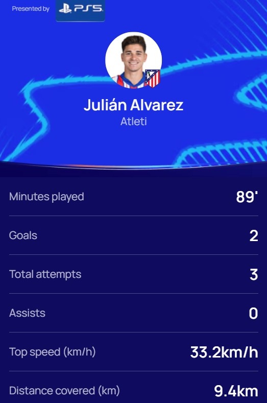 阿爾瓦雷斯在本場(chǎng)比賽3次射門(mén)打進(jìn)2球,另有2次關(guān)鍵傳球和6次成功對(duì)抗。歐冠官方也在賽后將他評(píng)為本場(chǎng)最佳球員。