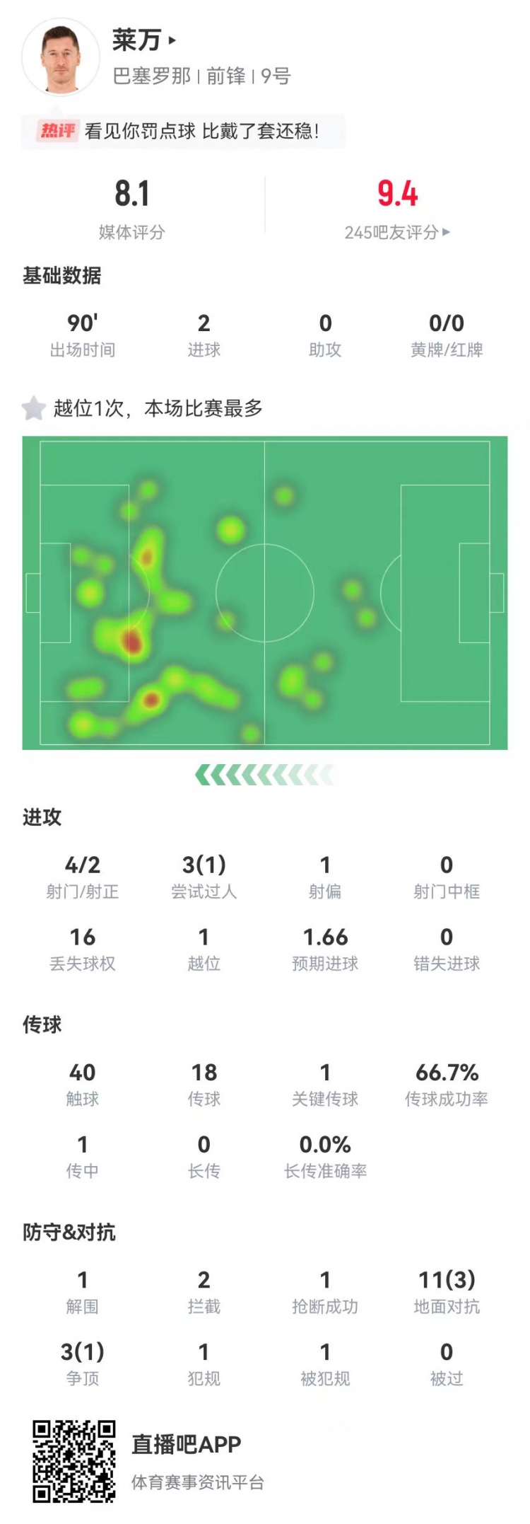發(fā)布時間:2025年01月22日 06:50點擊:欄目:足球新聞 1月22日訊 巴薩在本輪歐冠進球大戰(zhàn)5-4絕殺本菲卡,萊萬本場數(shù)據(jù)如下:首發(fā)踢滿全場2球預期進球1.664射門、2射正3過人、1成功40觸球18傳球、12成功,成功率67%1關(guān)鍵傳球1傳中、0成功1創(chuàng)造重大機會14對抗、4成功16丟失球權(quán)1犯規(guī)1造犯規(guī)1越位1解圍2攔截1搶斷獲評8.1分 除特別注明外,本站所有內(nèi)容均為九球直播整理排版,轉(zhuǎn)載請注明出處:萊萬本場4射2正進2球+1造良機 14對抗4成功 獲評8.1分 本文標簽: 足球 西甲 巴塞羅那 萊萬