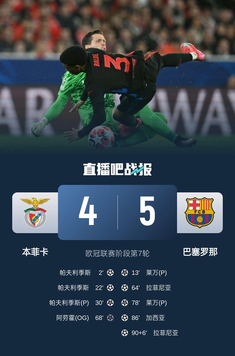 歐冠聯(lián)賽階段第7輪,巴薩5-4本菲卡。上半場,帕夫利季斯破門,巴爾德造點,萊萬點射扳平,什琴斯尼出擊失誤,帕夫利季斯打空門,什琴斯尼送點,帕夫利季斯點射完成帽子戲法;下半場,特魯賓開球擊中拉菲尼亞彈進球門,阿勞霍自擺烏龍,亞馬爾造點,萊萬點射再進,埃里克-加西亞頭球破門,拉菲尼亞補時絕殺。