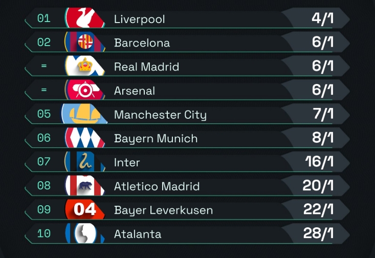 賽后,相關(guān)機(jī)構(gòu)更新了歐冠奪冠賠率。