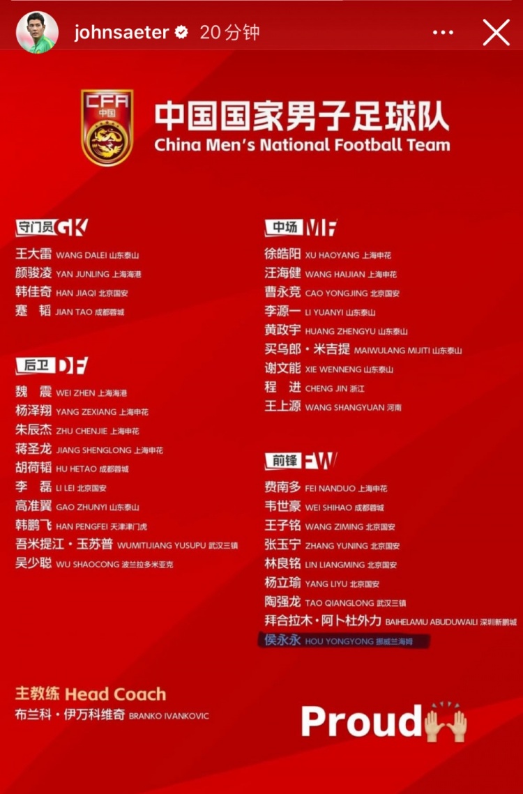 1月3日訊 入選國(guó)足集訓(xùn)名單后,侯永永更新社媒,他曬出了國(guó)足新一期名單的突破,并為此配文“Proud(自豪)”。