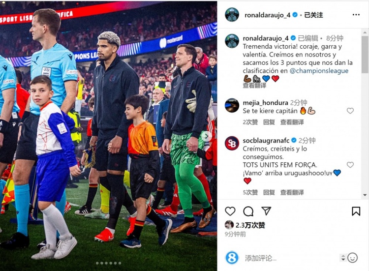 發(fā)布時間:2025年01月22日 10:50點(diǎn)擊:欄目:足球新聞 1月22日訊 歐冠第7輪比賽,阿勞霍踢滿全場,不慎烏龍,最終巴薩客場5-4擊敗本菲卡。阿勞霍在社交媒體上曬出踏上球場的照片,配文:“精彩的勝利!勇氣、堅毅和膽識。我們相信自己,最終拿到了3分,晉級歐冠16強(qiáng)!”阿勞霍還曬出了與絕殺功臣拉菲尼亞慶祝的照片,配上心形符號。 除特別注明外,本站所有內(nèi)容均為九球直播整理排版,轉(zhuǎn)載請注明出處:阿勞霍社媒:我們相信自己,最終拿到3分晉級歐冠16強(qiáng) 本文標(biāo)簽: 足球 西甲 巴塞羅那 歐冠