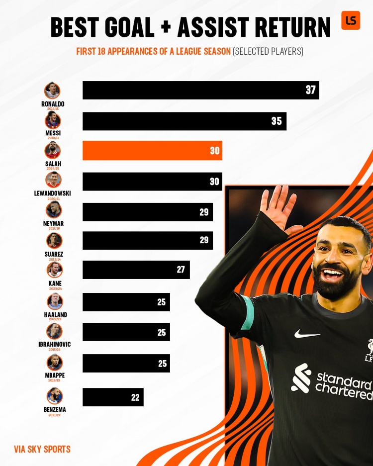 除特別注明外,本站所有內(nèi)容均為九球直播整理排版,轉(zhuǎn)載請(qǐng)注明出處:五大聯(lián)賽前18場(chǎng)參與進(jìn)球榜:C羅梅西前二,本賽季薩拉赫30球第三