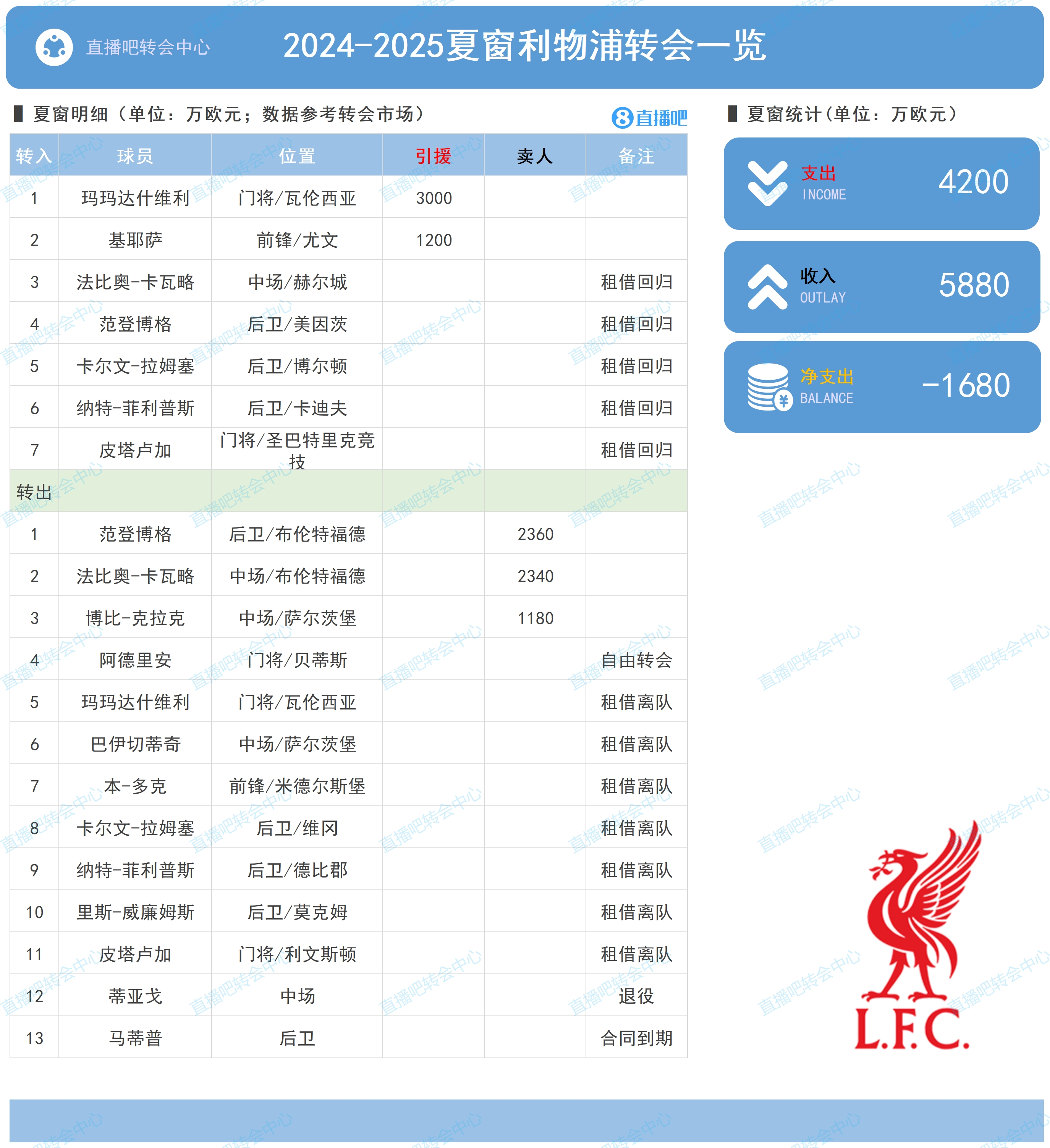 利物浦夏窗買人4200萬歐,賣人5880萬歐,凈支出-1680萬歐。
