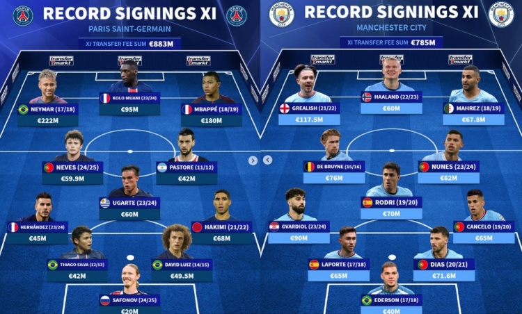 1月23日訊 巴黎和曼城在今晚歐冠焦點戰(zhàn)迎來強強對話,《轉會市場》也列出了兩隊隊史引援最貴陣。