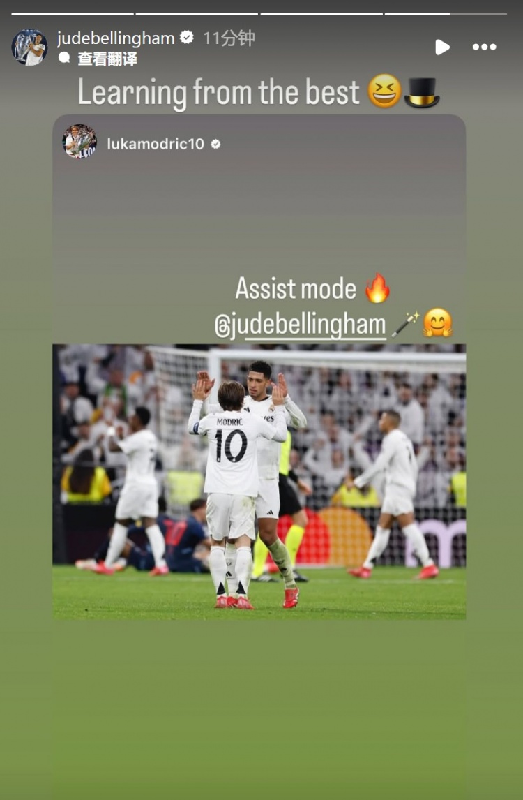 本場(chǎng)比賽貝林厄姆兩次送出助攻,莫德里奇下半場(chǎng)也助攻維尼修斯破門。賽后莫德里奇在社媒曬出與貝林厄姆的合照,配文稱贊道:“貝林厄姆開啟助攻模式!”后者則回應(yīng)道:“向最佳學(xué)習(xí)!”