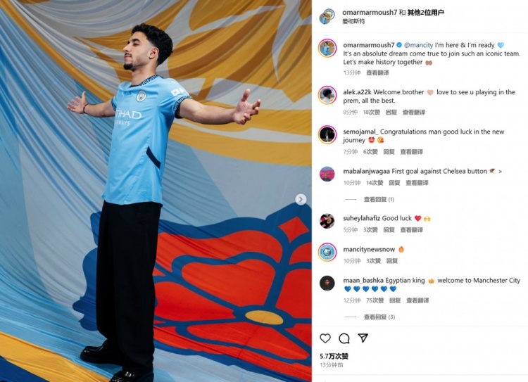 馬爾穆什還配文道:“@曼城,我已經(jīng)來到了這里并做好了準(zhǔn)備。能夠加盟這樣一家標(biāo)志性的俱樂部,實(shí)在是夢(mèng)想成真。讓我們一起創(chuàng)造歷史吧!”