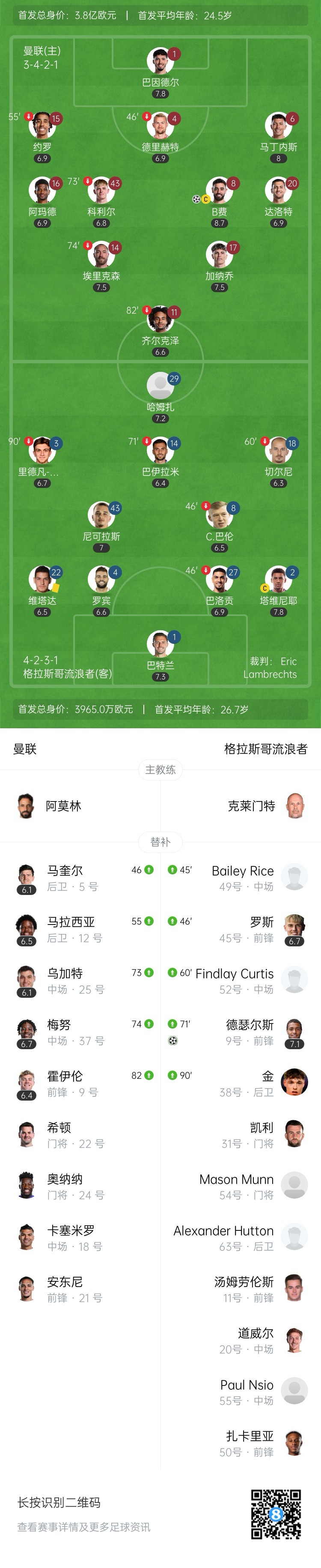 拉什福德已經(jīng)連續(xù)10場未能代表曼聯(lián)出戰(zhàn)。值得一提的是,本場比賽曼聯(lián)的替補(bǔ)席甚至還有三個空余,但主教練阿莫林寧愿在替補(bǔ)席留出三個空位,也不愿意帶上拉什福德。可以看到對手流浪者帶了12名替補(bǔ),而曼聯(lián)只有9名替補(bǔ)。
