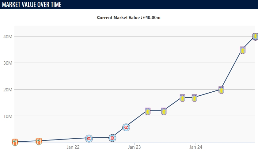 杜蘭現(xiàn)年21歲,維拉在2023年1月花費1664萬歐元將他引入,本賽季球員各項賽事代表維拉出場28次,總計出場時間1019分鐘,打進12球,沒有取得助攻。目前球員德轉(zhuǎn)身價為4000萬歐元。