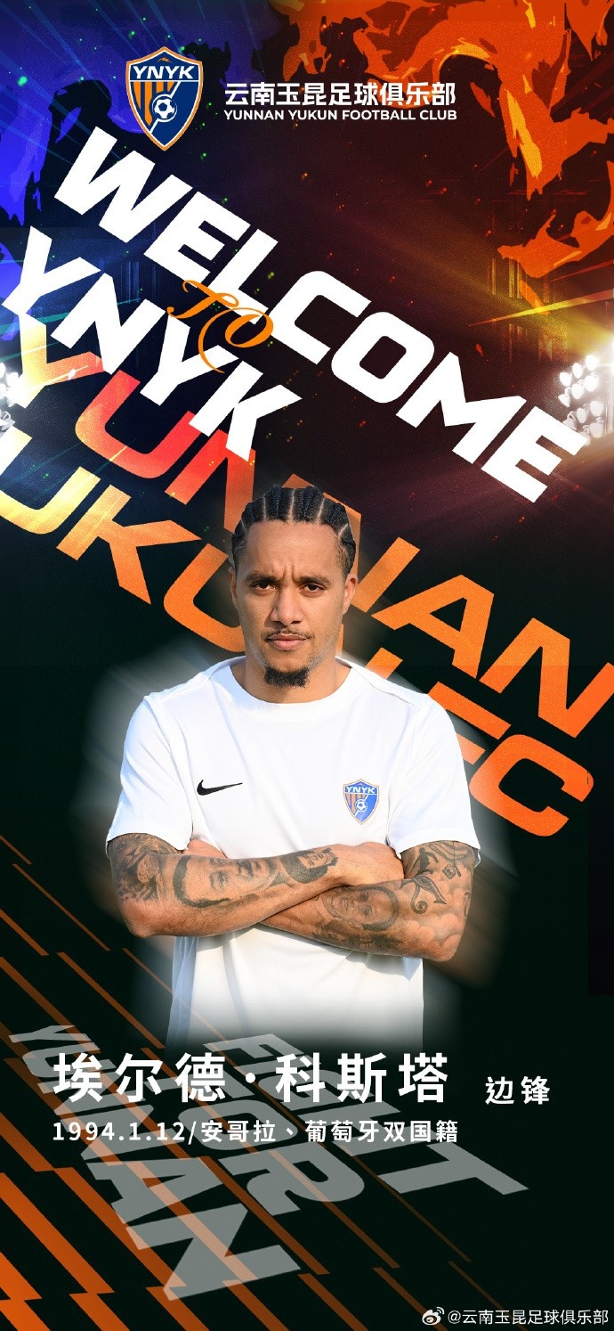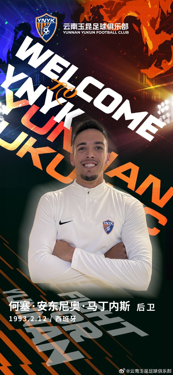 1月24日訊 中超升班馬云南玉昆官方宣布,外援埃爾德-科斯塔與西班牙籍球員何塞-安東尼奧-馬丁內(nèi)斯正式加盟球隊。