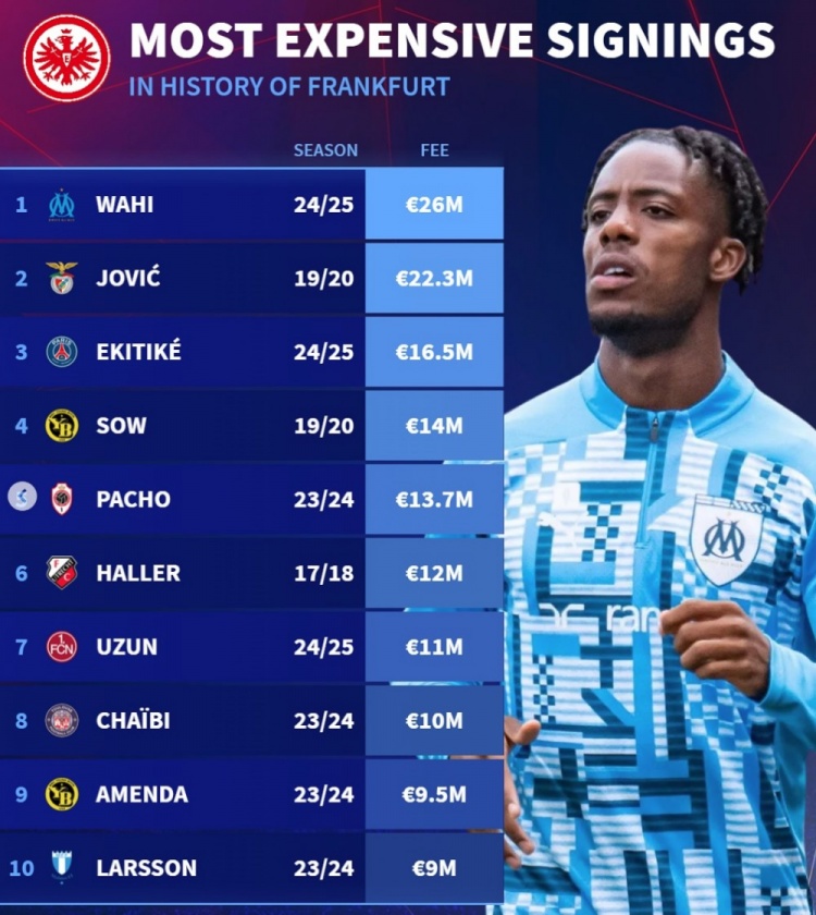 1月25日訊 在以7500萬歐出售馬爾穆什之后,法蘭克福迅速引進了法國前鋒瓦希,《轉會市場》也統(tǒng)計了法蘭克福隊史引援榜情況。