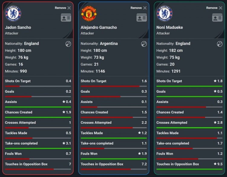 桑喬(曼聯(lián)外租切爾西,16場(chǎng)):場(chǎng)均0.4次射正、打進(jìn)0.2球,助攻0.4次、創(chuàng)造機(jī)會(huì)1.9次、嘗試傳中1次,搶斷0.5次、成功過(guò)人3.1次,造犯規(guī)0.7次、對(duì)方禁區(qū)內(nèi)觸球7次