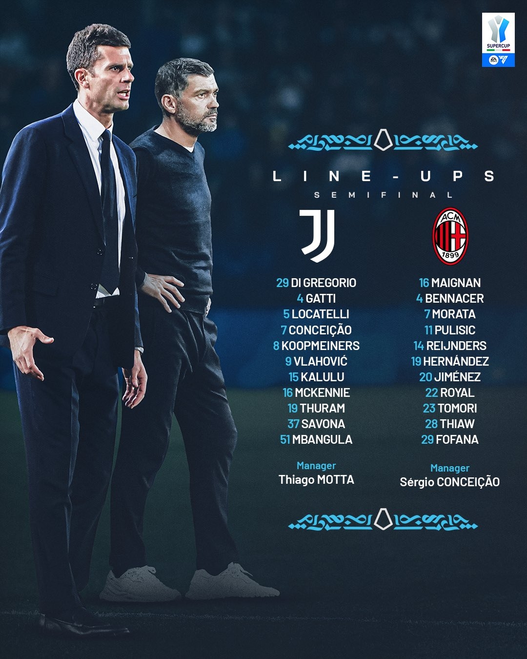 1月4日訊 意大利超級杯半決賽,尤文主場對陣AC米蘭。賽前,官方公布了本場的首發(fā)名單。