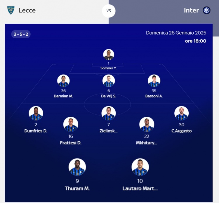 1月26日訊 周一凌晨,意甲第22輪,國米對陣萊切。意天空預(yù)測了本場比賽的國米首發(fā)陣容,與周中歐冠相比,本場比賽首發(fā)有4處輪換。