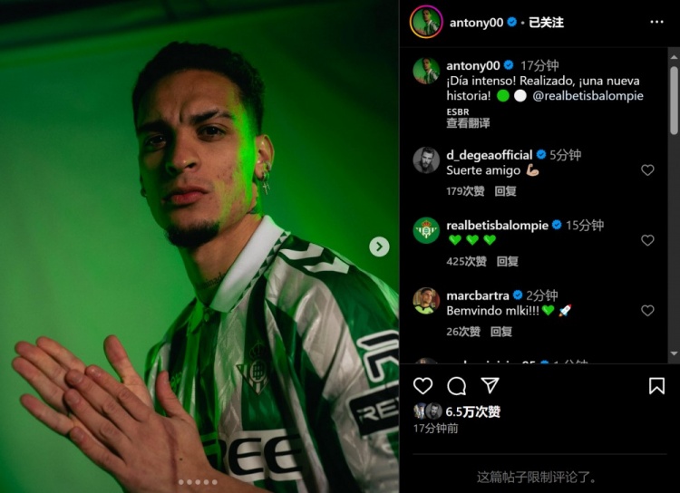 安東尼曬出身穿貝蒂斯球衣的照片,并寫道:忙碌的一天結束了!開始新的故事!