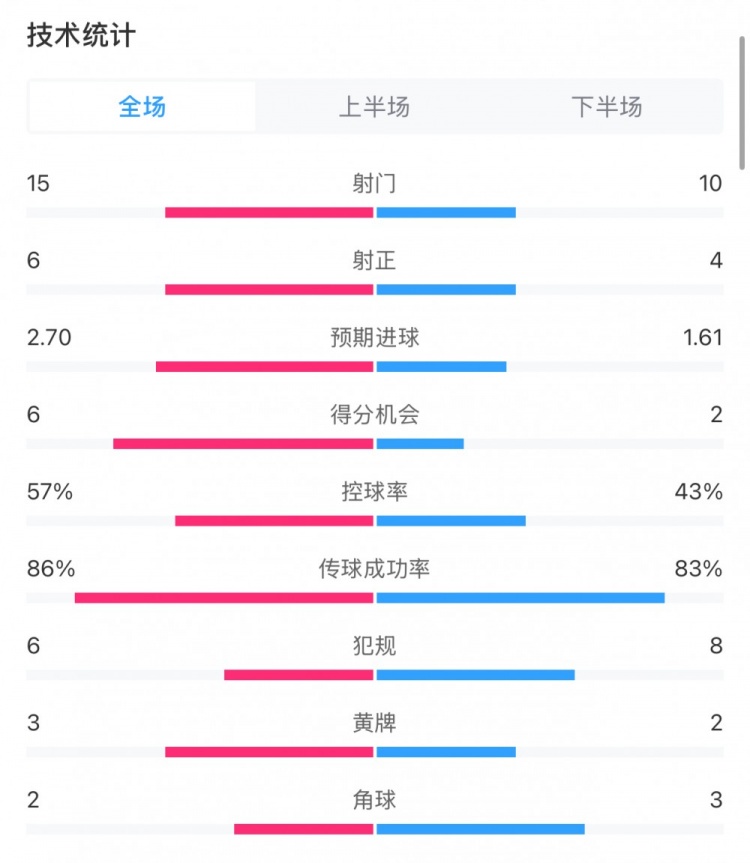 發(fā)布時間:2025年01月26日 03:55點擊:欄目:足球新聞 1月26日訊 英超第23輪,曼城3-1切爾西。兩隊全場數(shù)據(jù):(曼城在前)射門:15-10射正:6-4預(yù)期進球:2.70-1.61得分機會:6-2控球率:57%-43%傳球成功率:86%-83%犯規(guī):6-8黃牌:3-2角球:2-3 除特別注明外,本站所有內(nèi)容均為九球直播整理排版,轉(zhuǎn)載請注明出處:曼城3-1切爾西全場數(shù)據(jù):射門15-10,射正6-4,得分機會6-2 本文標簽: 足球 英超 切爾西 曼城