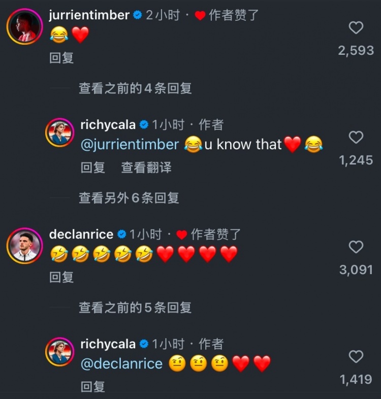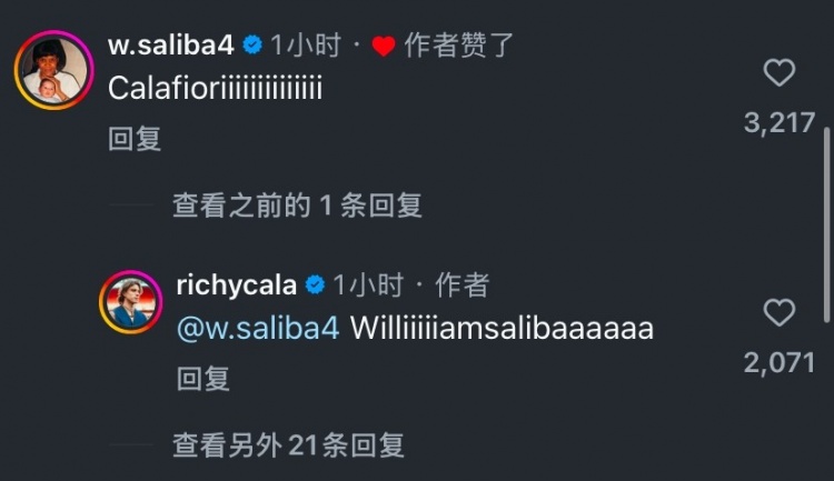 在評論區(qū)里,廷伯、賴斯和薩利巴紛紛和他互動。