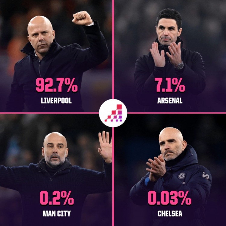 發(fā)布時(shí)間:2025年01月26日 06:50點(diǎn)擊:欄目:足球新聞 1月26日訊 在英超第23輪部分比賽完賽后,Opta更新了本賽季英超的奪冠概率,利物浦升至了92.7%。Opta本賽季英超奪冠概率:利物浦92.7%阿森納7.1%曼城0.2%切爾西0.03% 除特別注明外,本站所有內(nèi)容均為九球直播整理排版,轉(zhuǎn)載請(qǐng)注明出處:Opta英超奪冠概率:利物浦92.7%,阿森納7.1%,曼城0.2% 本文標(biāo)簽: 足球 英超 切爾西 阿森納 曼城 利物浦