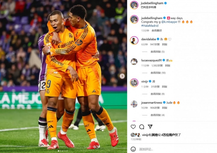 發(fā)布時(shí)間:2025年01月26日 07:50點(diǎn)擊:欄目:足球新聞 1月26日訊 西甲第21輪,姆巴佩戴帽,皇馬客場(chǎng)3-0戰(zhàn)勝巴拉多利德。賽后,貝林厄姆更新社媒,曬出同姆巴佩的合照,并表示道:客場(chǎng)比賽送出1次助攻,祝賀我的兄弟姆巴佩?。?! 除特別注明外,本站所有內(nèi)容均為九球直播整理排版,轉(zhuǎn)載請(qǐng)注明出處:貝林厄姆社媒:客場(chǎng)比賽送出1次助攻,祝賀我的兄弟姆巴佩 本文標(biāo)簽: 足球 西甲 皇家馬德里 姆巴佩 貝林厄姆