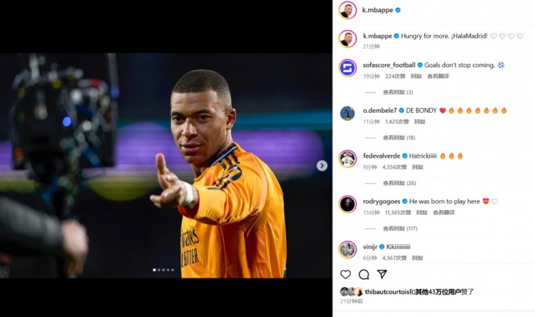 發(fā)布時間:2025年01月26日 07:50點(diǎn)擊:欄目:足球新聞 1月26日訊 西甲第21輪,姆巴佩戴帽,皇馬客場3-0戰(zhàn)勝巴拉多利德。賽后,姆巴佩更新了社媒動態(tài):渴望更多,皇馬加油! 除特別注明外,本站所有內(nèi)容均為九球直播整理排版,轉(zhuǎn)載請注明出處:皇馬生涯首次戴帽!姆巴佩:渴望更多,皇馬加油! 本文標(biāo)簽: 足球 西甲 皇家馬德里 姆巴佩