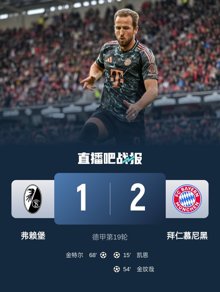 德甲第19輪,拜仁客場2-1弗賴堡,凱恩、金玟哉進球。