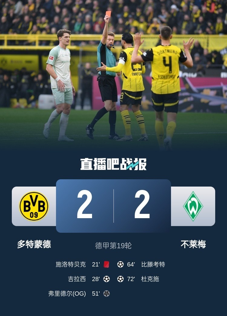 德甲第19輪,多特2-2不萊梅,施羅特貝克紅牌,吉拉西破門。