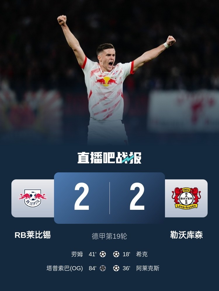 德甲第19輪,勒沃庫森2-2RB萊比錫,???、阿萊克斯進球。