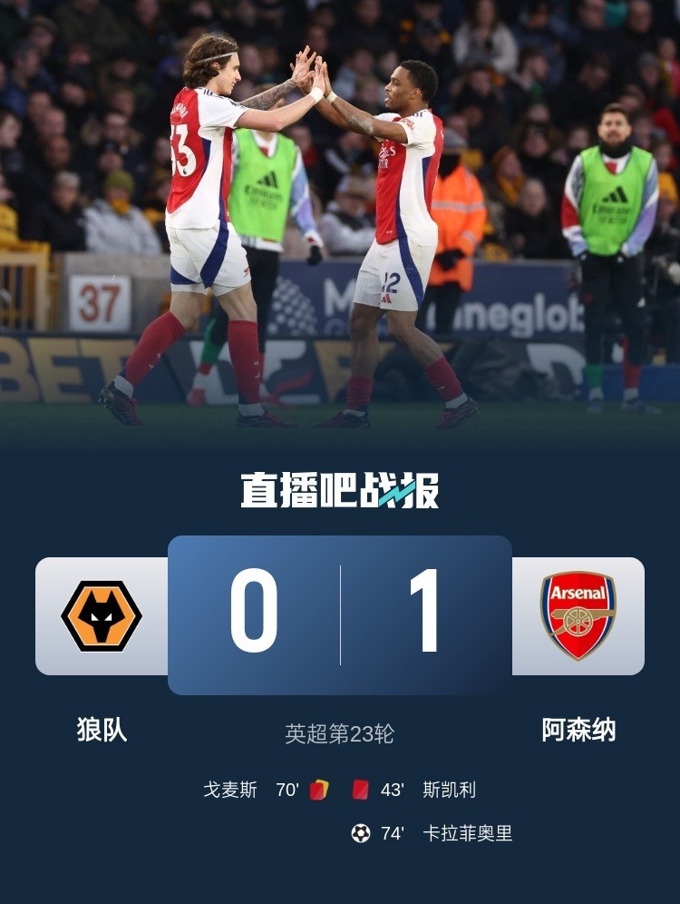英超聯(lián)賽第23輪,十人阿森納1-0十人狼隊,斯凱利染紅惹爭議,卡拉菲奧里制勝。