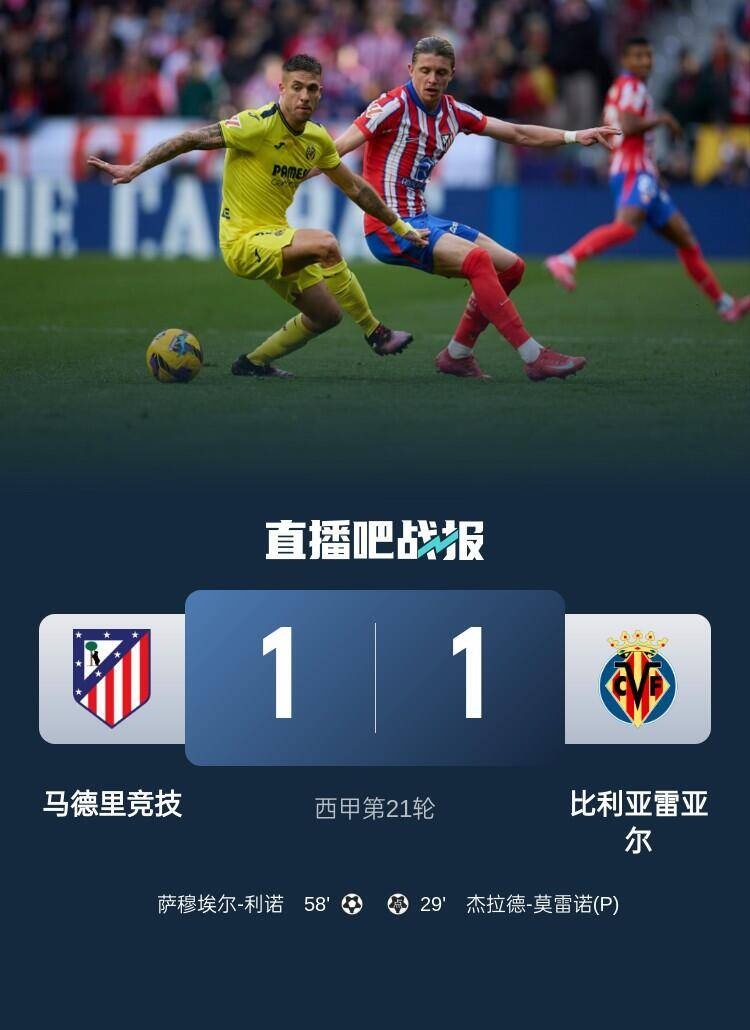西甲第21輪,馬德里競技1-1戰(zhàn)平比利亞雷亞爾,利諾進球。
