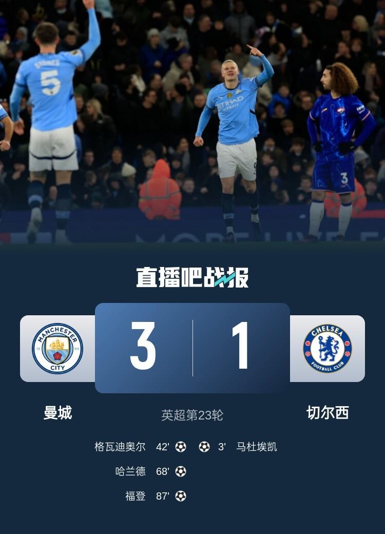 英超第23輪,曼城3-1逆轉(zhuǎn)雙殺切爾西,哈蘭德傳射,胡桑諾夫首秀送禮。