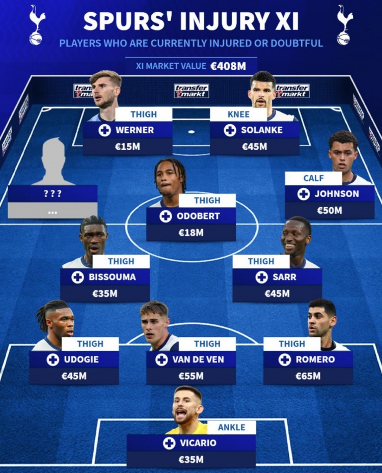 德轉(zhuǎn)列熱刺當(dāng)前傷員陣:總身價(jià)4.08億歐元