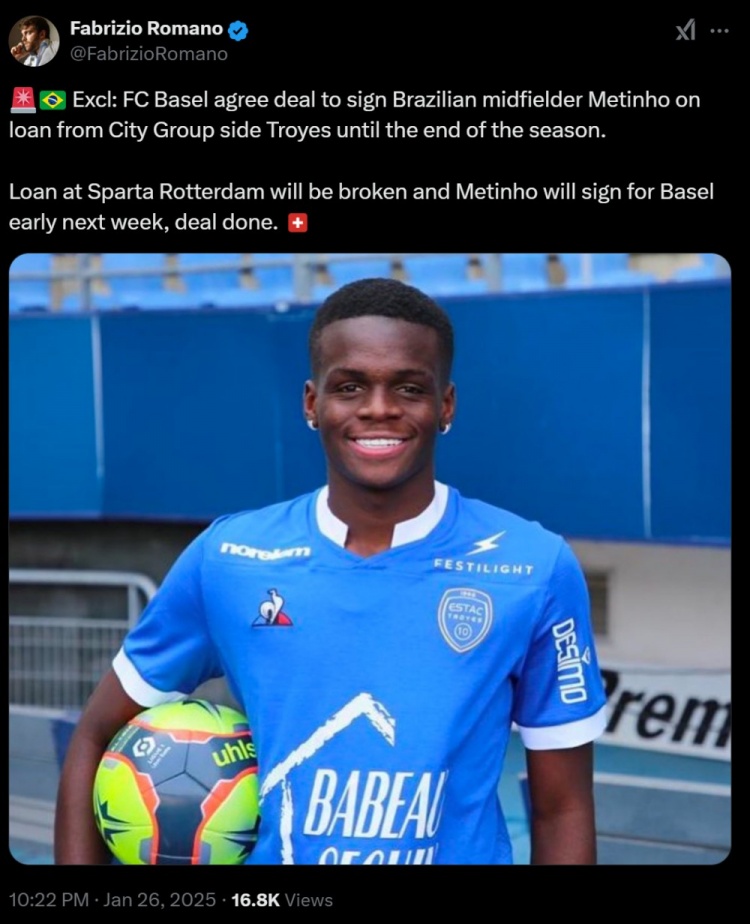 1月26日訊 據(jù)名記羅馬諾獨家消息,瑞士俱樂部巴塞爾已經(jīng)和城市足球集團(tuán)旗下俱樂部特魯瓦達(dá)成協(xié)議,將租借21歲巴西中場梅蒂尼奧,租期至本賽季結(jié)束。