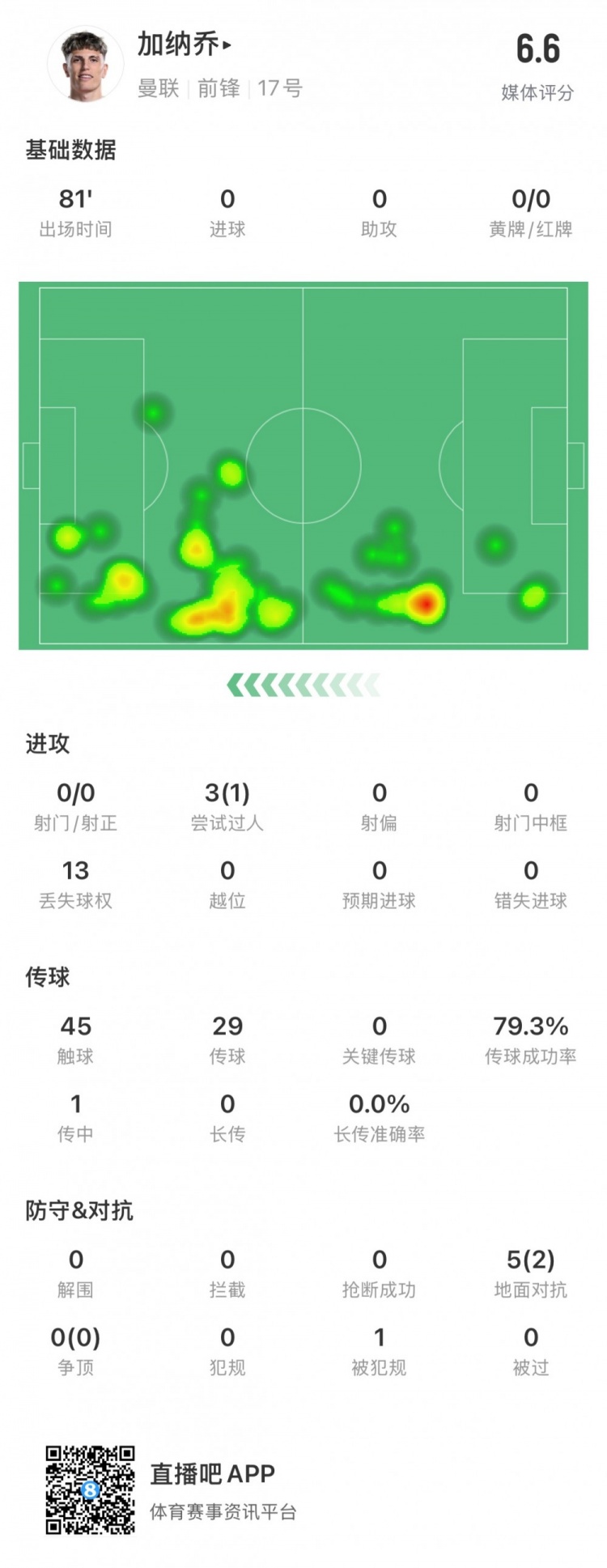 觸球45次,傳球29次,傳球成功率79.3%,傳中1次