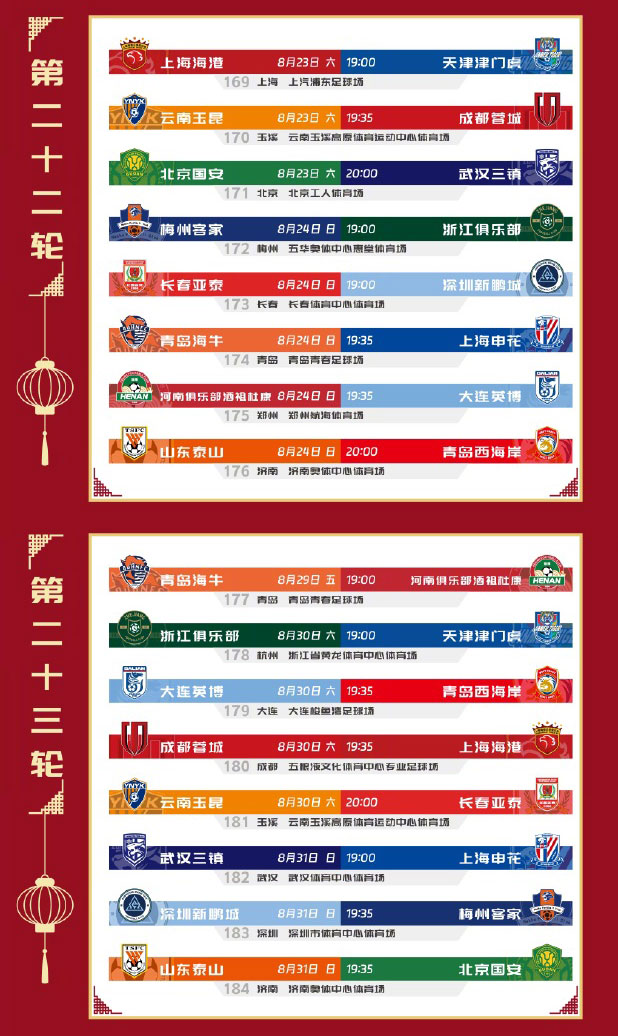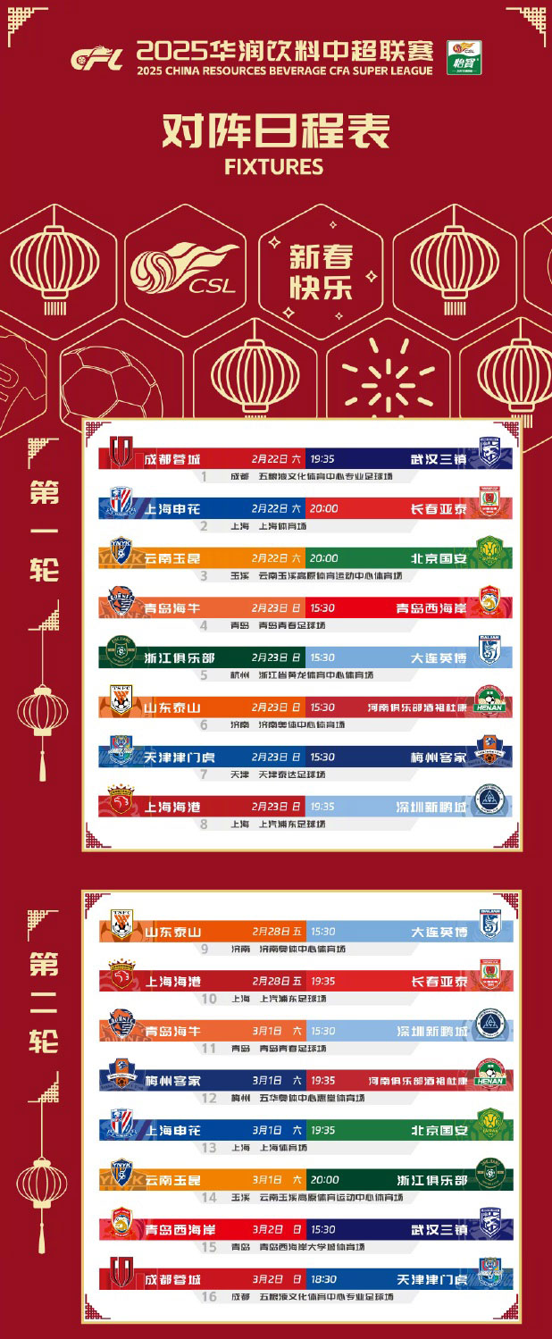 2025賽季中超揭幕戰(zhàn)是成都蓉城對(duì)陣武漢三鎮(zhèn),在2月22日周六19點(diǎn)35打響。次輪將迎來京滬大戰(zhàn),上海申花主場對(duì)陣北京國安,比賽時(shí)間是3月1日周六19點(diǎn)35。