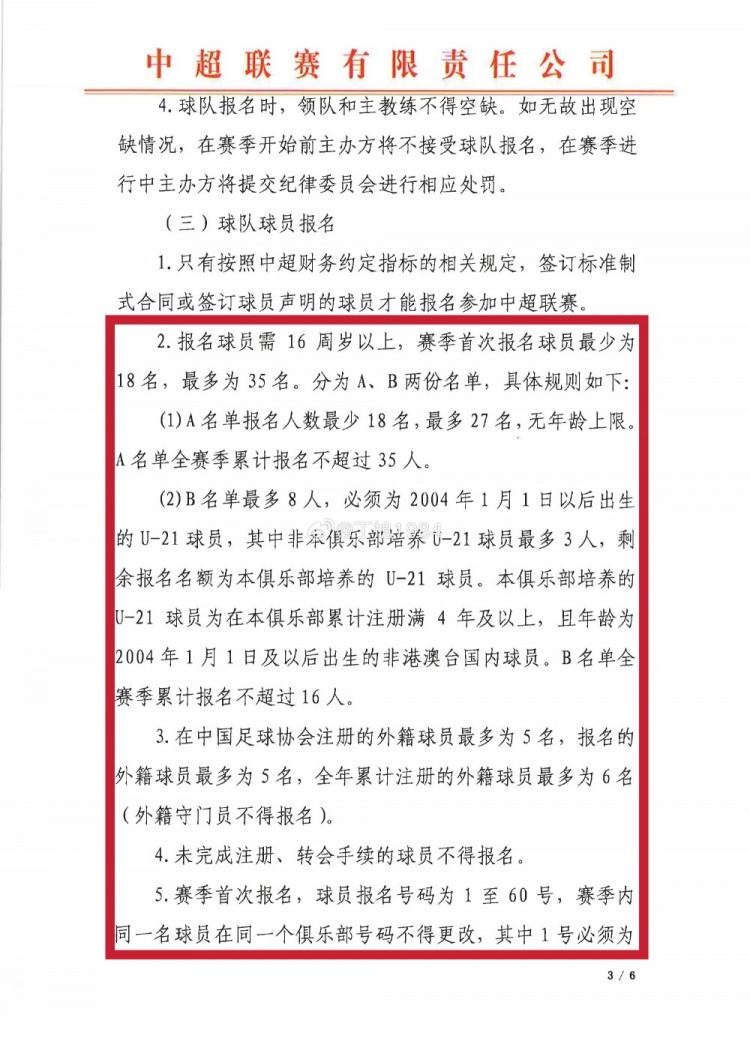 2025賽季中超首次球員報名規(guī)則跟2024賽季相比有一些變化: