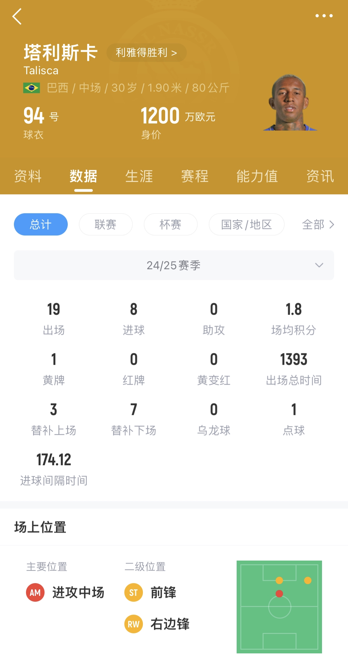 塔利斯卡現(xiàn)年30歲,2021年從廣州加盟利雅得勝利,本賽季為利雅得勝利出戰(zhàn)19場比賽,打進8球,出場時間1393分鐘。根據(jù)此前媒體的報道,塔利斯卡的轉(zhuǎn)會費為1800萬美元。