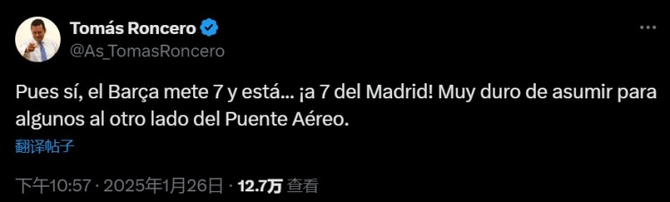 龍賽羅在社交媒體上寫道:“是的,巴薩打進了7球,但是現(xiàn)在……仍然落后皇馬7分!對于一些身處空中橋梁另一端的人來說,這很難讓他們接受?!?/p>