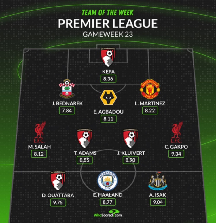 1月27日訊 本輪英超全部結(jié)束,數(shù)據(jù)網(wǎng)站W(wǎng)hoscored評(píng)選出本輪英超最佳陣容,其中哈蘭德、薩拉赫、利桑德羅在列,以下為具體陣容: