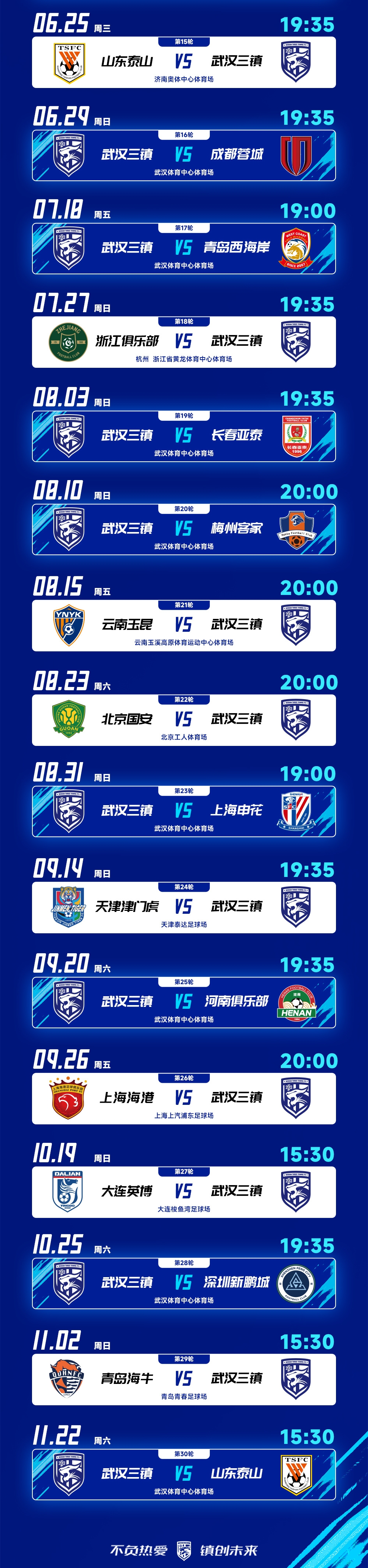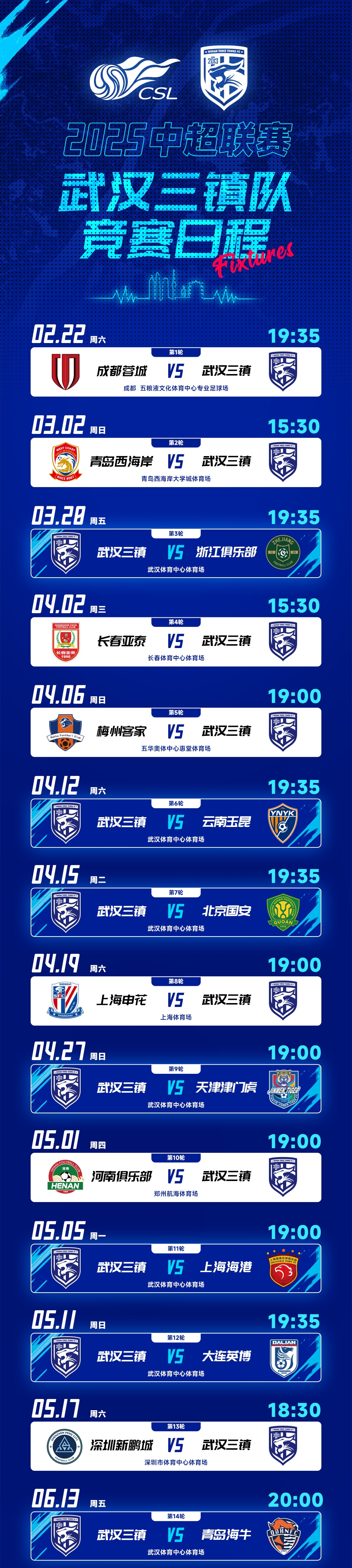 2025賽季中超聯(lián)賽武漢三鎮(zhèn)隊(duì)競賽日程出爐,轉(zhuǎn)發(fā)、收藏起來!