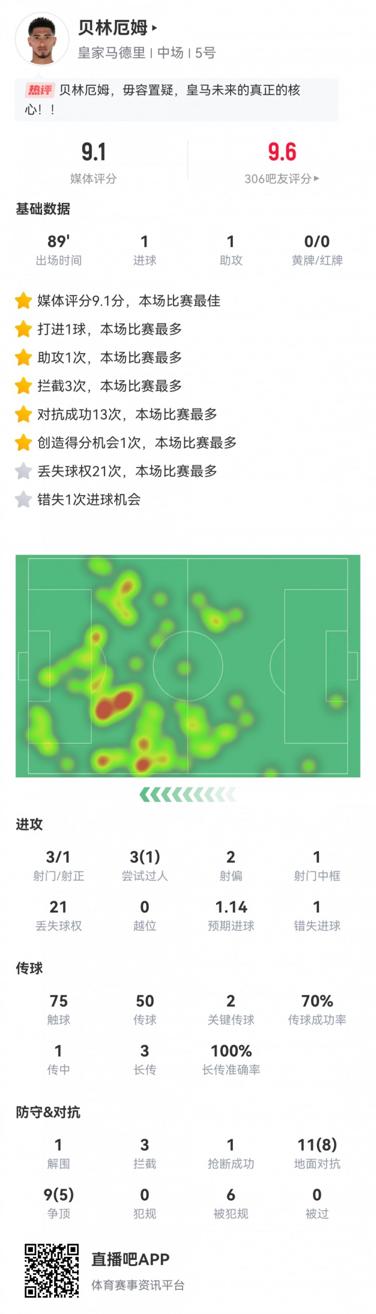 發(fā)布時間:2025年01月04日 06:50點擊:欄目:足球新聞 1月4日訊 西甲第12輪補賽,皇馬2-1逆轉(zhuǎn)絕殺瓦倫。此役貝林厄姆再次上演補時絕殺的好戲,球員全場重點數(shù)據(jù)如下↓1粒進球1次助攻3射1正3次過人成功1次1次失點1次中框預(yù)期進球1.141次錯失進球21次丟失球權(quán)2次關(guān)鍵傳球20次對抗成功13次6次被犯規(guī)評分9.1全場最高 除特別注明外,本站所有內(nèi)容均為九球直播整理排版,轉(zhuǎn)載請注明出處:補時絕殺!貝林數(shù)據(jù):傳射建功,1失點2關(guān)鍵傳球,全場最高9.1分 本文標簽: 西甲 皇家馬德里 貝林厄姆 足球