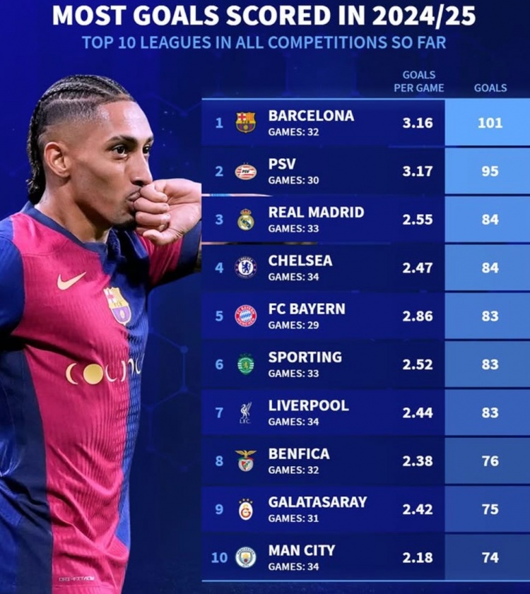 德轉(zhuǎn)列本賽季歐洲前十聯(lián)賽球隊(duì)各項(xiàng)賽事總進(jìn)球榜:
