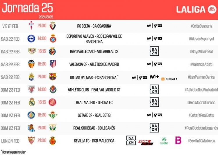 1月27日訊 西甲官方公布了西甲第25輪聯(lián)賽開球時(shí)間,北京時(shí)間賽程如下:
