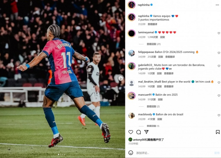 本賽季拉菲尼亞狀態(tài)爆棚,在代表巴薩31場(chǎng)各項(xiàng)賽事出場(chǎng)中已經(jīng)貢獻(xiàn)23球9助攻,他在個(gè)人社媒曬出本場(chǎng)慶祝進(jìn)球的照片,配文寫道:“加油!拿下重要的三分!”