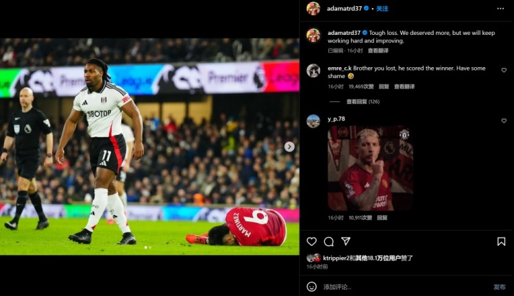 比賽后,富勒姆前鋒特勞雷更新了社媒,曬出了一張利馬倒地的照片,似乎再次回應(yīng)了兩人此前的爭論。特勞雷還寫道:一場艱難的失利,我們值得更多,但我們會繼續(xù)努力、取得進(jìn)步。