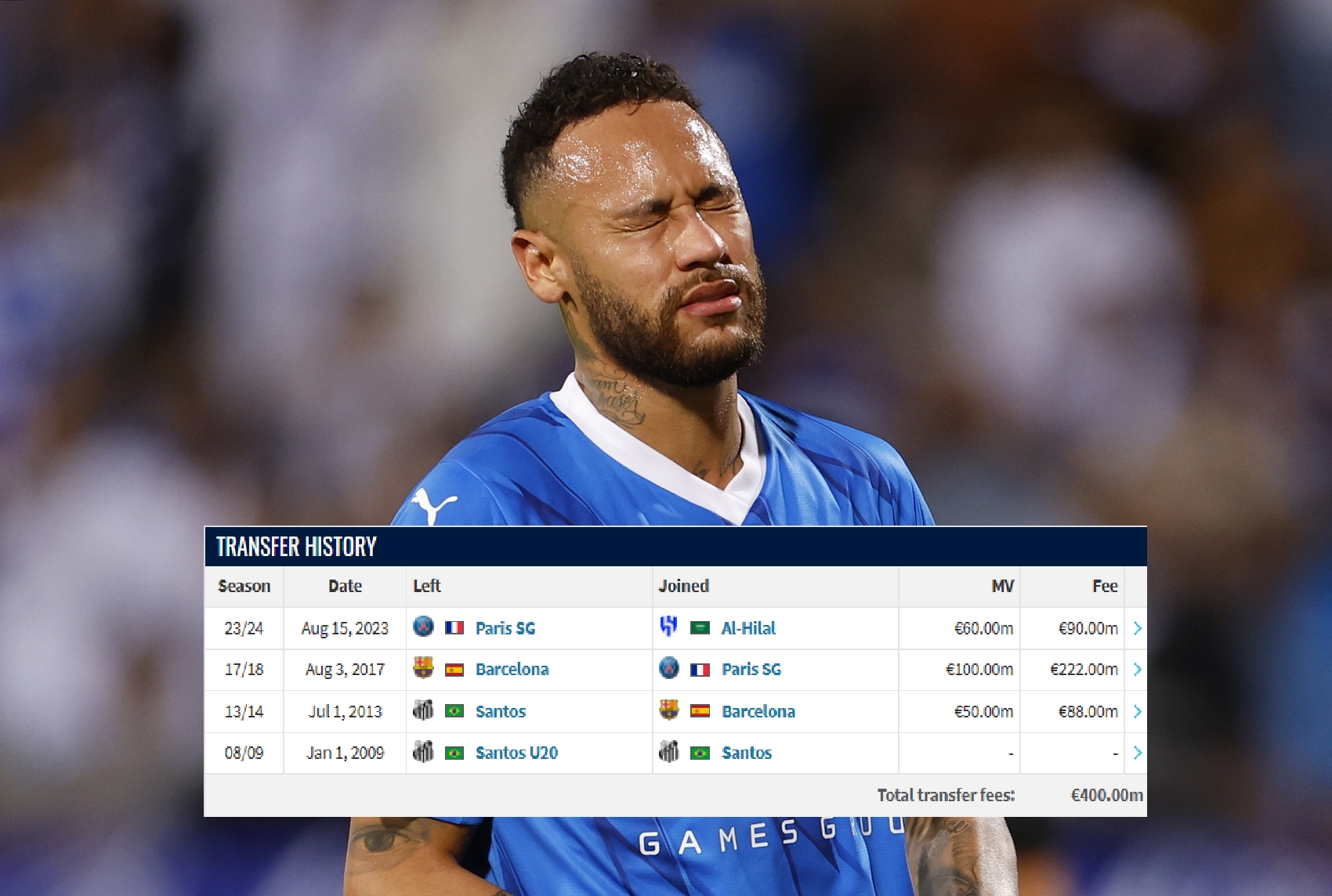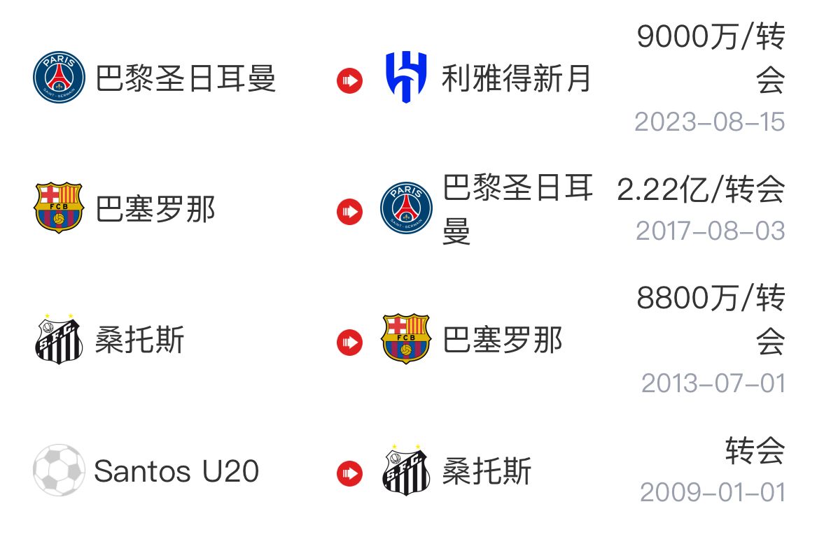 內(nèi)馬爾職業(yè)生涯轉(zhuǎn)會(huì)路線(xiàn)(生涯累計(jì)總轉(zhuǎn)會(huì)費(fèi):4億歐元)↓