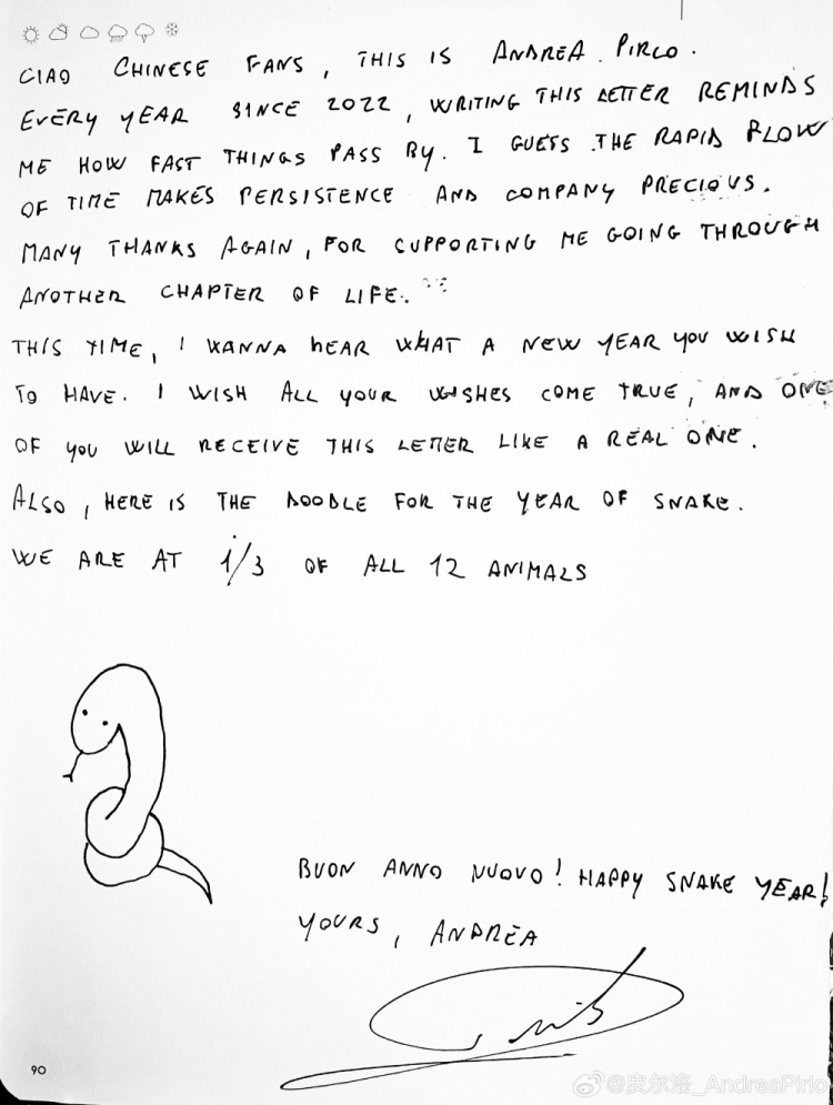 - 皮爾洛手寫拜年信:堅持與陪伴格外珍貴,愿你們的心愿都能成真
