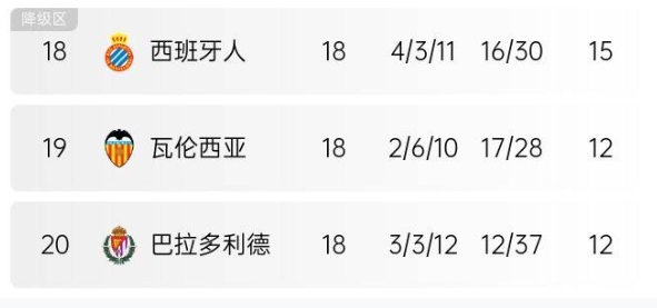 在西甲前18輪,瓦倫西亞僅取得2勝6平10負(fù)的戰(zhàn)績(jī),積12分排名倒數(shù)第二。