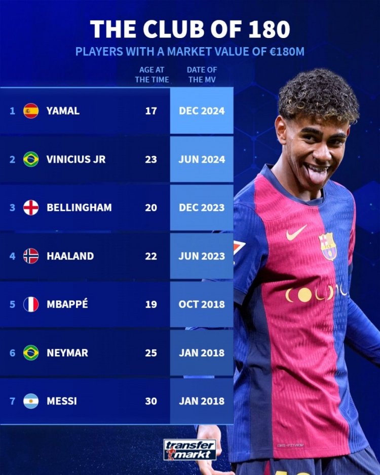 除特別注明外,本站所有內(nèi)容均為九球直播整理排版,轉(zhuǎn)載請(qǐng)注明出處:德轉(zhuǎn)歷史7人達(dá)到1.8億歐身價(jià):梅西、姆巴佩、亞馬爾、哈蘭德在列